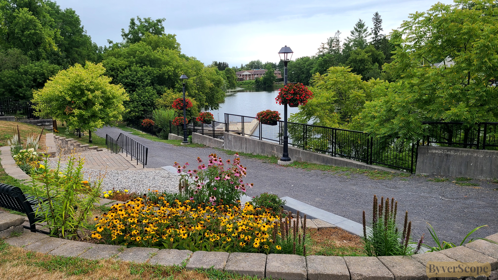- Riverside Rotary Park with flags and landscaped beds